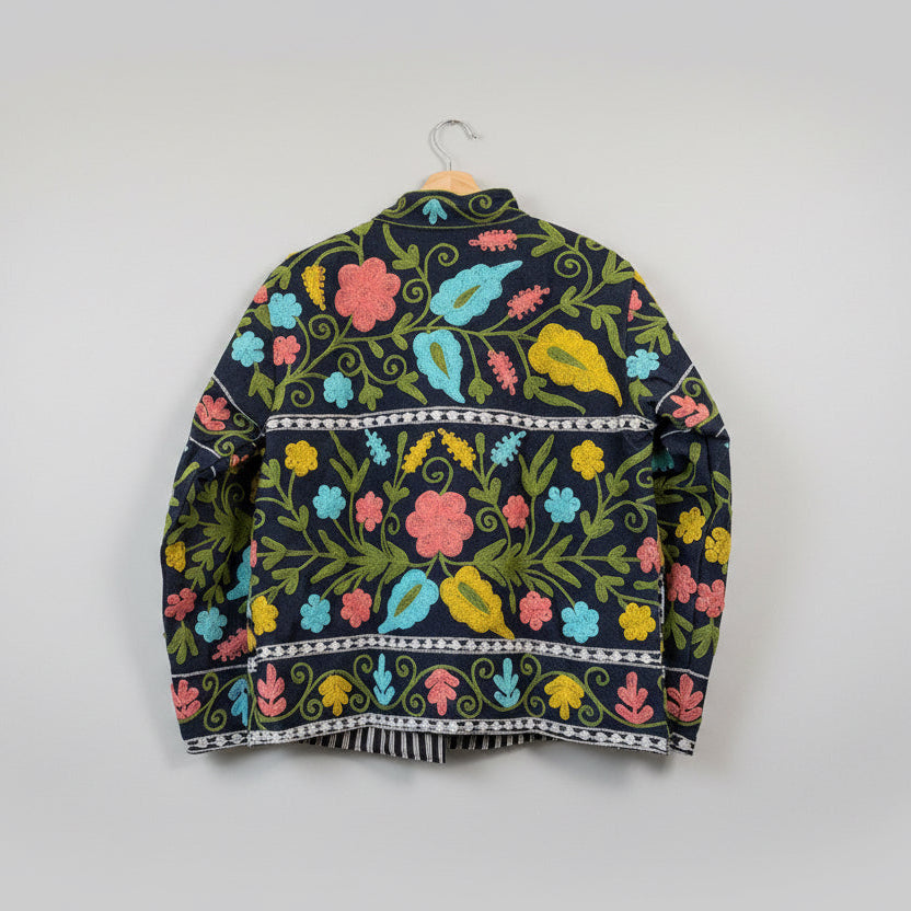 Wrap yourself in timeless artistry with our Denim fabric Suzani Jacket, beautifully adorned with traditional Suzani embroidery. Set on rich, soft denim, each jacket showcases intricate motifs and vibrant threads that celebrate heritage with a modern bohemian edge. Designed as a true statement piece, it works effortlessly for both everyday wear and special occasions.