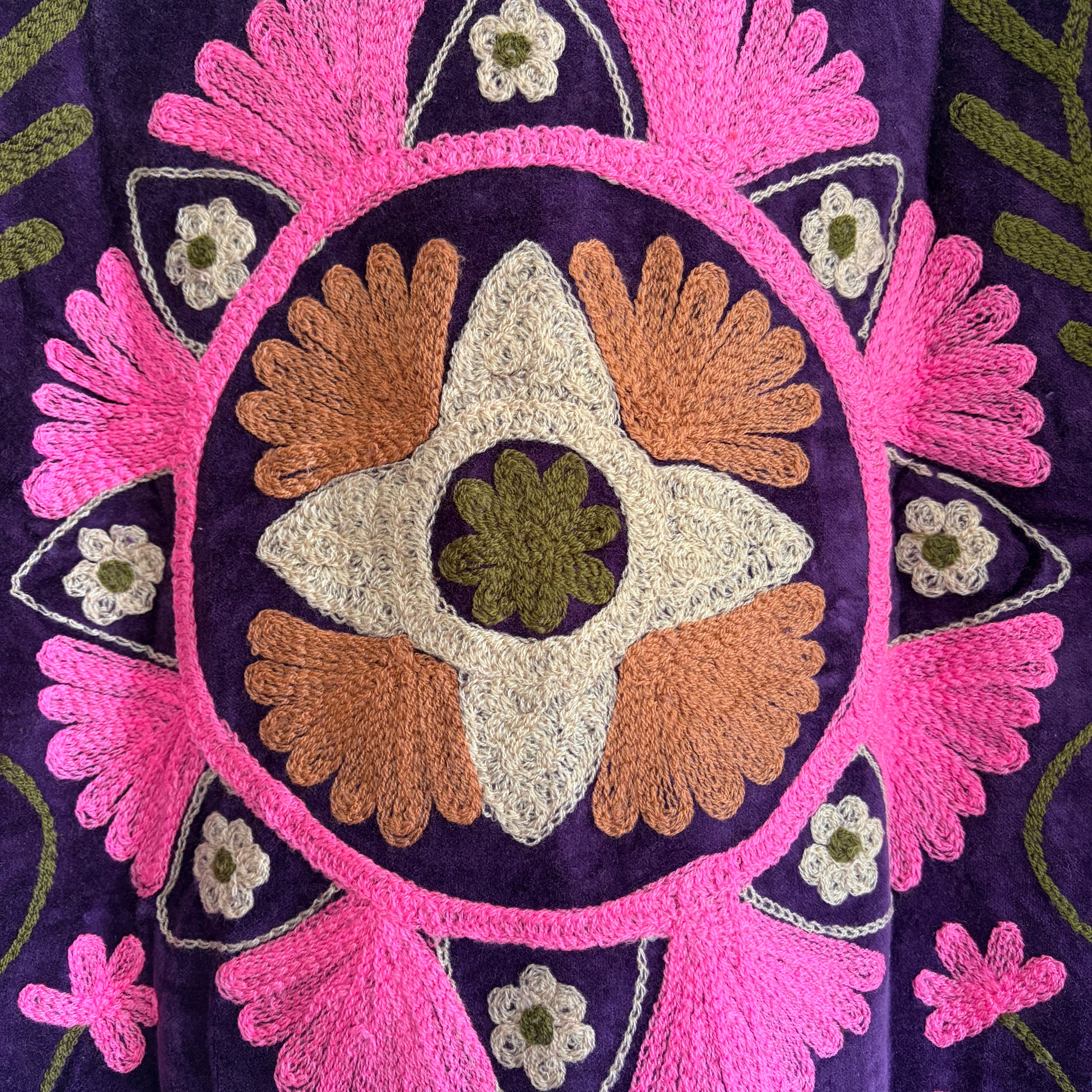Wrap yourself in timeless artistry with our Velvet Suzani Jacket, beautifully adorned with traditional Suzani embroidery. Set on rich, soft velvet, each jacket showcases intricate motifs and vibrant threads that celebrate heritage with a modern bohemian edge. Designed as a true statement piece, it works effortlessly for both everyday wear and special occasions.